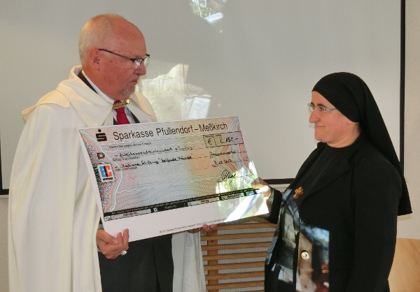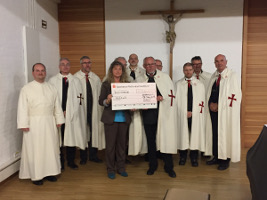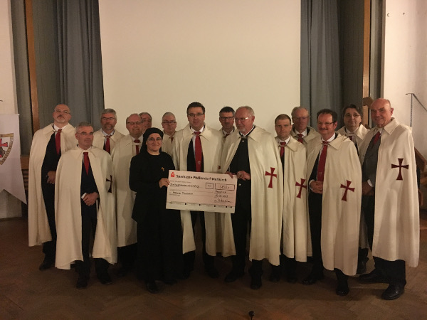 Für die Ordensbrüder war klar, dass man Schwester Hatune sicherlich keinen persönlichen und somit physischen Geleitschutz auf ihrer weltweiten Mission geben kann. Also haben wir für sie und ihre im Jahre 2011 gegründete Schwester-Hatune-Stiftung innerhalb unserer Bruderschaft im Süden gesammelt und so konnte unser Ordensmeister Dr.med. Reinhard Steinmann Schwester Hatune einen symbolischen Scheck in Höhe von 2.150,00 Euro am Ende des Vortrags überreichen. Dies ist für unsere Bruderschaft, gemessen an der Anzahl ihrer Mitglieder eine Summe, die uns doch mit etwas Stolz erfüllt hat. Schade war, dass die geladene lokale Presse von dieser Veranstaltung keine Notiz nahm.