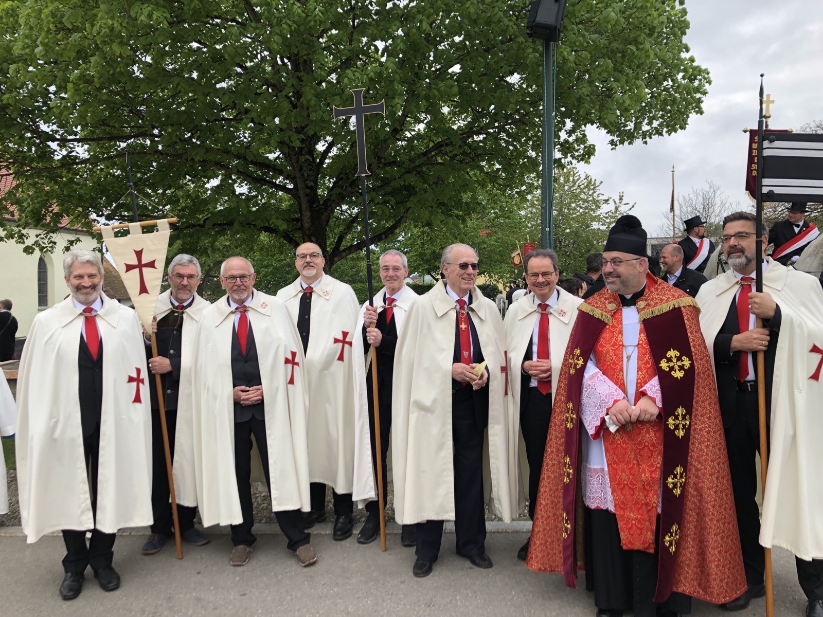 Die in diesem Jahr terminlich günstig gelegenen Wallfahrten zum „Heiligen Blut“ (Blutritt) in Weingarten und dem Georgiritt (Wallfahrt zum Heiligen Georg) im Deggenhausertal nutze die Komturei Süd für eine Teilnahme und die Durchführung eines Familienkonvents. Eindrücklich die Lichterprozession am Vorabend des Blutfreitags in Weingarten und die grosse Reiterprozession am Blutfreitag, die Obr. Pfarrer Jürgen Schmidt zu Pferd absolvierte. Etwas beschaulicher und dennoch prägend dann der Georgiritt am Sonntag, quasi am Sitz der Komturei im Deggenhausertal. Schon im 13. Jahrhundert wird die Georgskirche in Limpach erwähnt. Bereits damals kamen Pilger um dem Heiligen Georg in der Wallfahrtskirche Nöte und Sorgen anzuvertrauen. Seit über 300 Jahren kommen Reiter zu Ehren des Hl. Georg nach Limpach. Auch in diesem Jahr beteiligte sich eine Gruppe von Ordensrittern der Komturei Süd des OMCT Tempelritterordens bei der Wallfahrt. Die Ordensbrüder zogen allerdings die eignen Füsse dem Ross vor.
