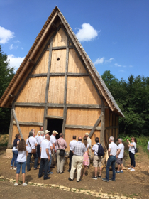 Als Gastgeber hatten Ordensbruder Wolfgang Maute und seine Frau Rosa, denen an dieser Stelle nochmals ein herzliches Dankeschön und vergelt`s Gott ausgesprochen sei, zunächst auf die Klosterbaustelle Campus Galli (Bauen wie vor 1200 Jahren) eingeladen. Hier entsteht Tag für Tag ein Stück Mittelalter: Handwerker und Ehrenamtliche schaffen mit den Mitteln des 9. Jahrhunderts ein Kloster auf Grundlage des St.Galler Klosterplans. Von den vielfältigen Aktivitäten und Baufortschritten konnten sich die rund 40 Teilnehmer bei sonnigem Wetter ein umfassendes Bild machen. Herzstück bildet im Klosterplan, der um das Jahr 830 entstand, natürlich die Kirche, von der allerdings noch nicht viel zu sehen ist. Bisweilen muss man sich daher mit dem Besuch der Holzkirche begnügen, die als Provisorium um das als erstes Objekt errichtete Steinkreuz erbaut wurde. Für das leibliche Wohl wurde zunächst nach mittelalterlichem Vorbild (Karolingische Wurst mit Linseneintopf und Dennetle) gesorgt, bevor sich am Ende der Führung und Besichtigung Kaffee und Kuchen anschlossen. Es folgte ein heiterer, geselliger und letztlich langer Abend bei Speis und Trank.